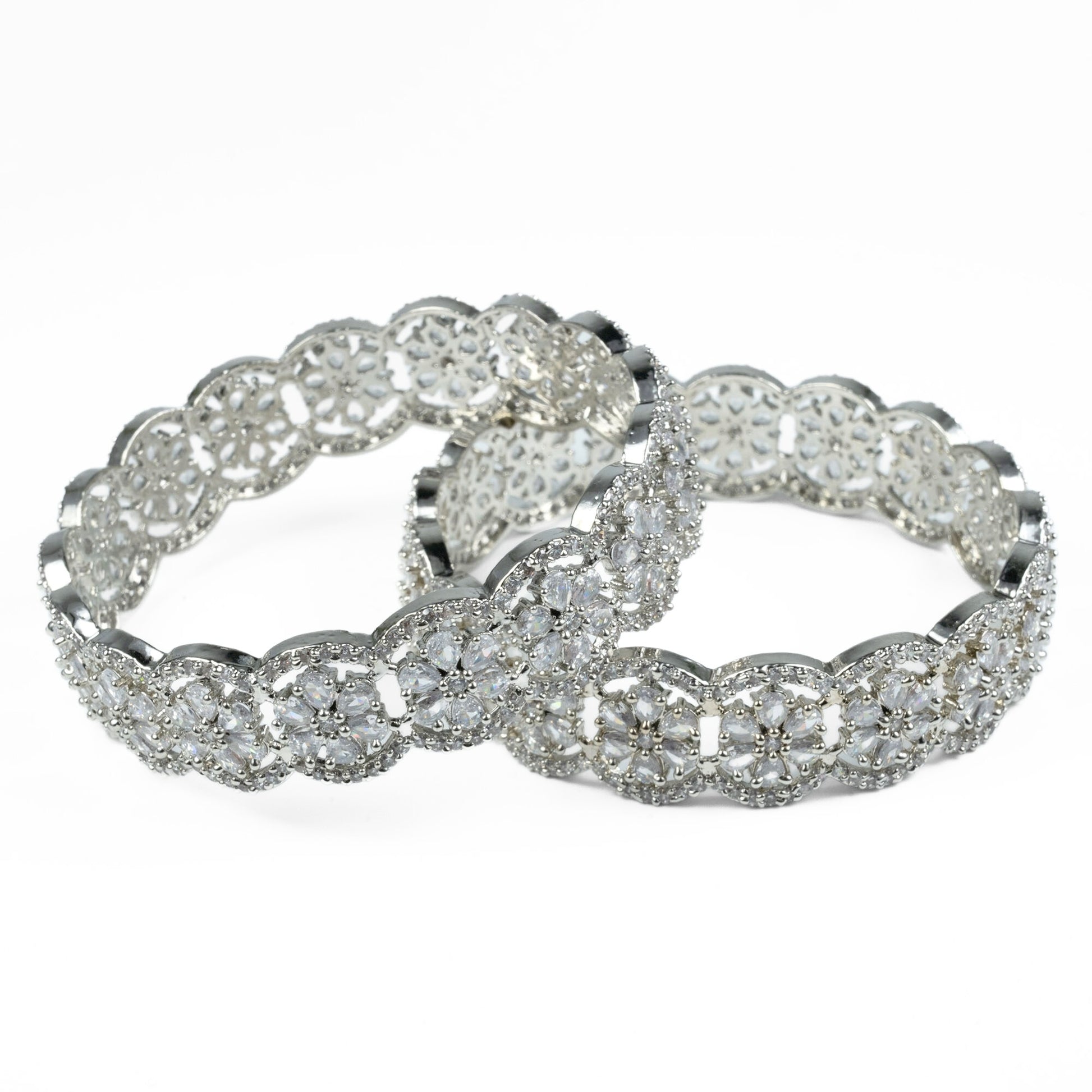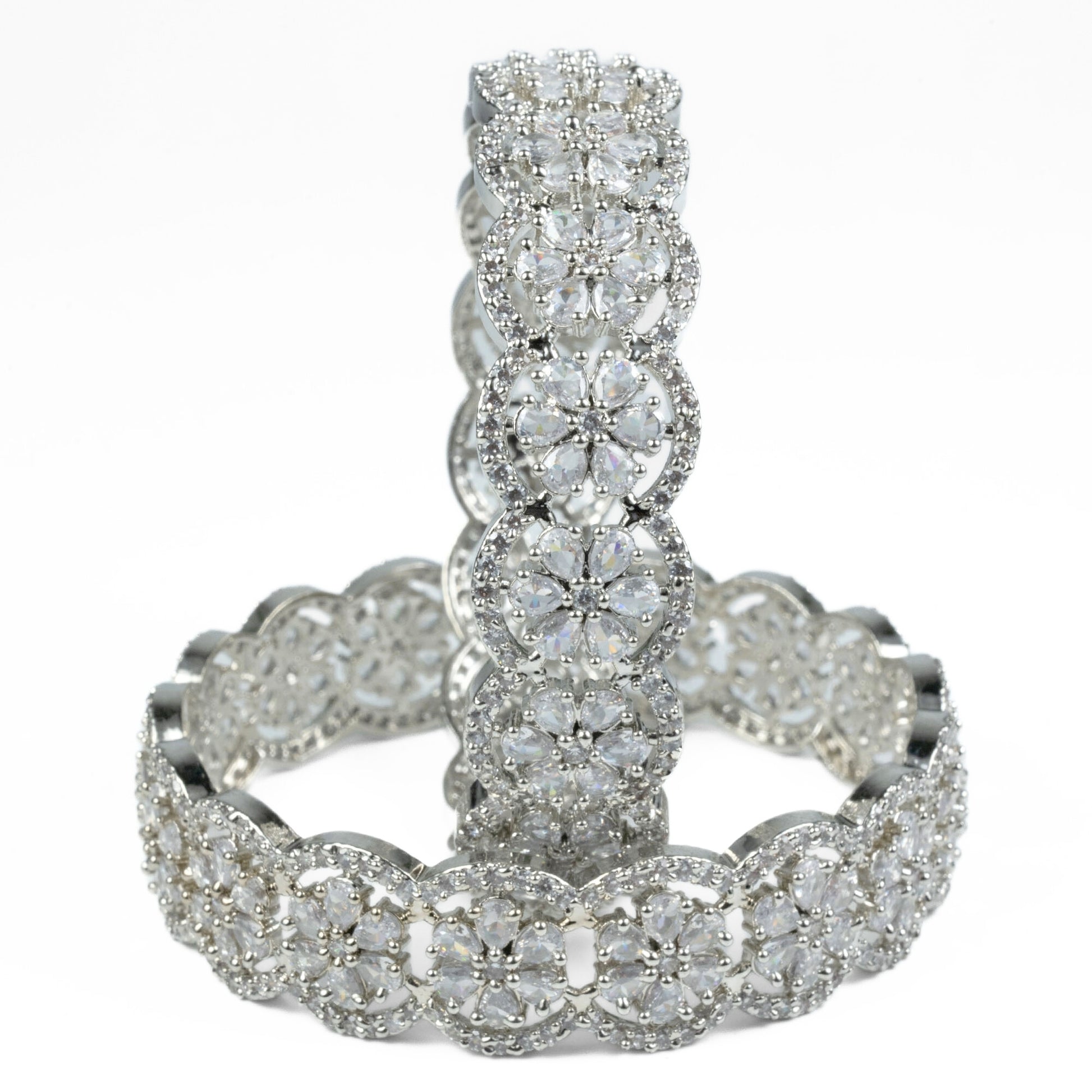 Elevate your outfit with these divine American Diamond Flower Bangles. This pack of two features stunning floral designs crafted with sparkling American diamonds. Add a touch of luxury to any ensemble with these exquisite bangles. Perfect for the modern woman who wants to make a statement.