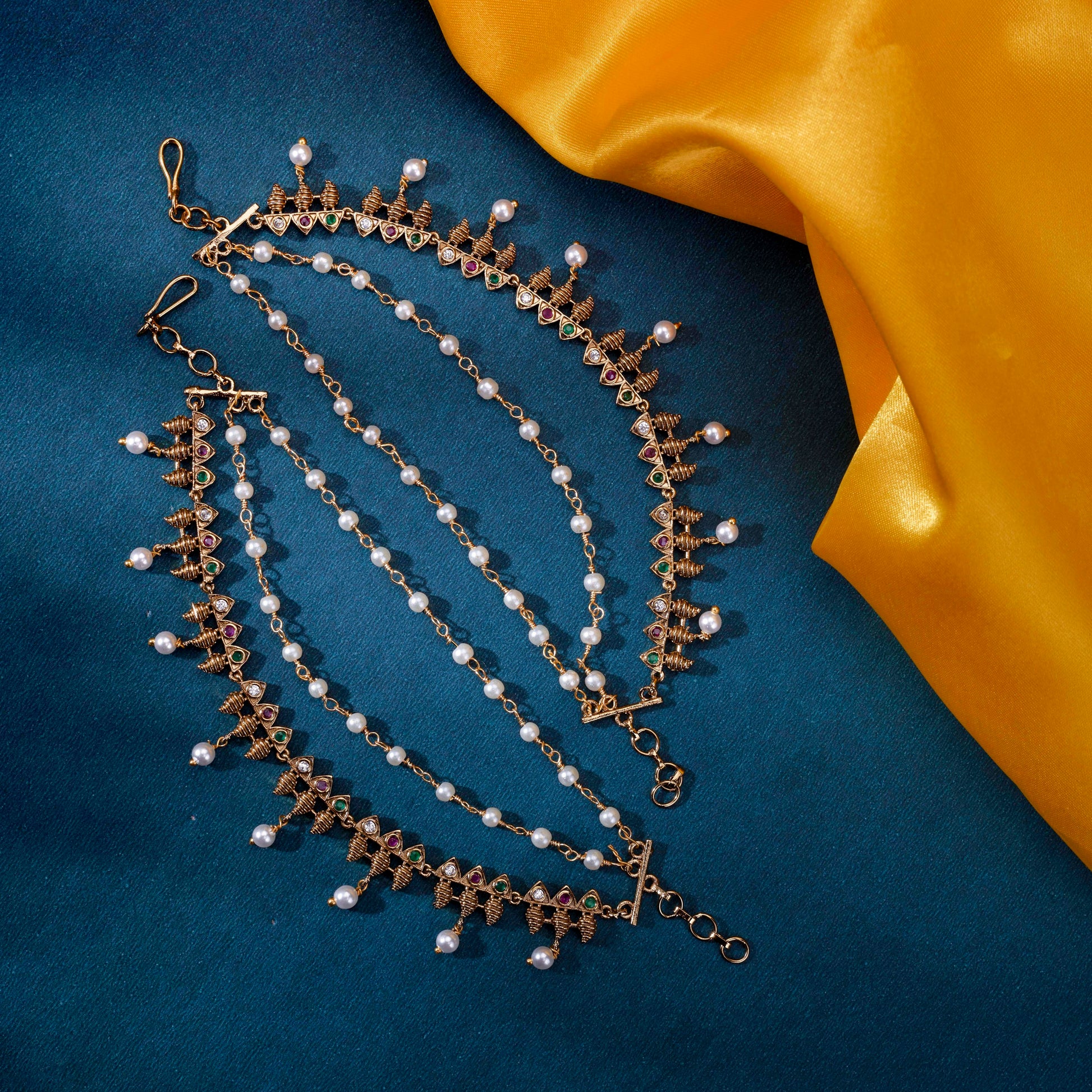 Adorn yourself with timeless elegance through this stunning Mehendi Plated Pearl Stone Floral Kaan Chain. Featuring beautifully carved floral motifs embellished with lustrous pearl stones, this traditional ear ornament showcases authentic craftsmanship. The warm mehendi plating gives it a sophisticated, vintage-inspired appeal that complements bridal wear and festive attire perfectly. Lightweight yet striking, it drapes gracefully along the ear, adding a touch of refined beauty to your celebration look. An essential piece for those who appreciate classic Indian jewelry.