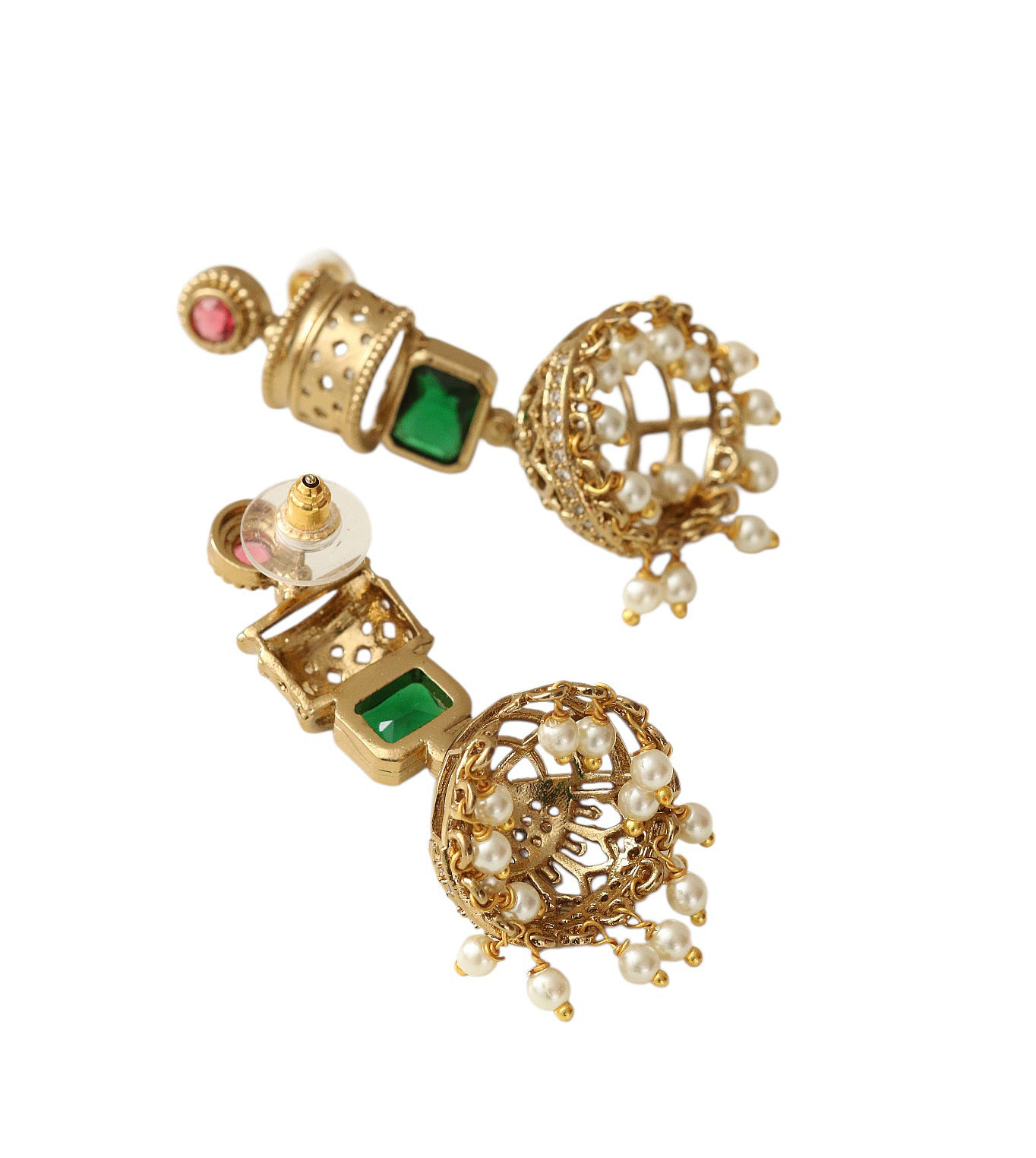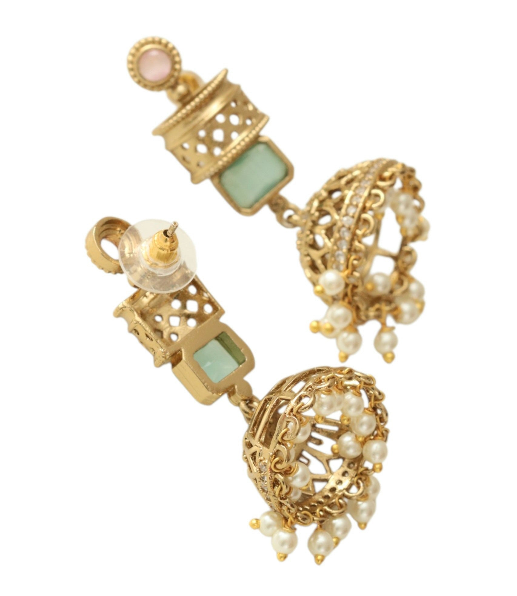 Elevate your ethnic ensemble with these exquisite square mehendi plated jhumkas. Crafted with traditional design sensibilities, these bell-shaped earrings feature a distinctive square silhouette finished in rich mehendi plating that complements warm skin tones beautifully. Perfect for weddings, festivals, and special occasions, they offer that classic charm with a contemporary twist. The lightweight construction ensures comfortable all-day wear, while the elegant design makes them versatile enough to pair with sarees, lehengas, or traditional kurtas. A timeless addition to your jewelry collection that celebrates cultural heritage with grace.